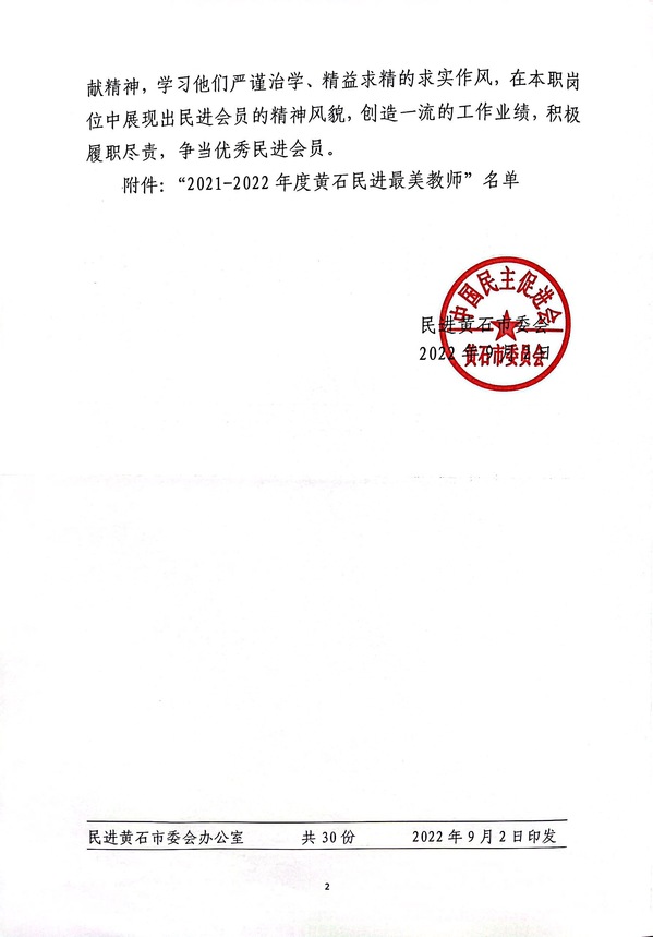 本网讯 近日,中国民主促进会黄石委员会决定,对在教育事业中做出突出贡献的教育界会员进行了表彰,华体网(中国)黄蓓佳同志荣获“2021-2022年度黄石民进最美教师”荣誉称号。