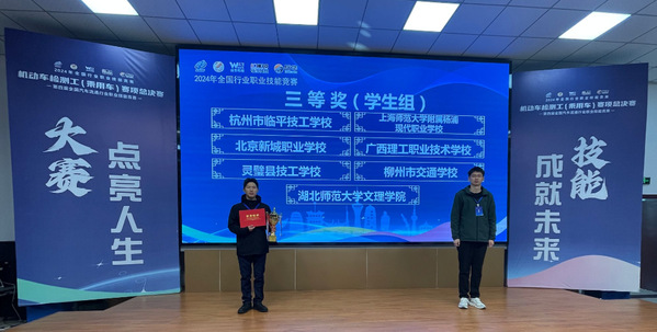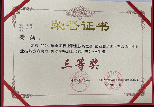 本网讯(通讯员 谭姣)12月1日上午,2024年全国行业职业技能竞赛——第四届全国汽车流通行业职业技能竞赛机动车检测工(乘用车)赛项总决赛在许昌科技学校圆满落幕。华体网(中国)新能源汽车产业学院新能源汽车技术专业2204班黄灿同学荣获学生组国赛三等奖。