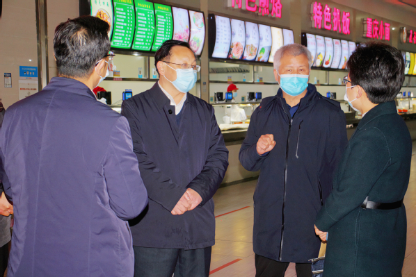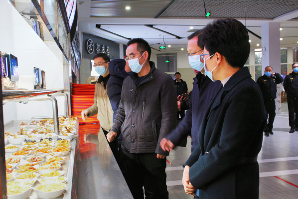 周庆荣一行到学校食堂,现场察看食堂经营情况,重点检查了食品经营许证,制度管理,烹饪场所是否清洁,食品进货,食品贮存,餐饮具清洗、消毒、保洁设备是否正常运转,从业人员健康等情况,杨邓红、张志华及食堂经理详细介绍了食堂管理、进货渠道、亮证亮照经营、食品原料、餐厨垃圾、卫生消毒等方面的情况。