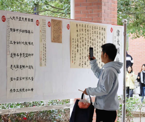 展览分书法、绘画、手工艺品三类,同学们以笔墨抒情,用丹心写意,精心创作出不同时期、不同题材、不同表现形式的符合主题的作品近200幅,吸引了众多师生驻足观看。
