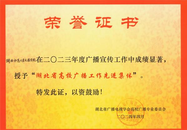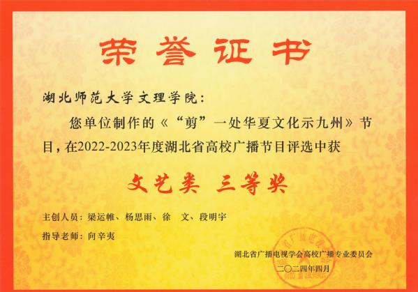 本网讯(通讯员 张慧萍)4月19日,全省高校广播专业委员会工作会议在湖北经济学院召开。会议通报了2022-2023 年度湖北省高校广播节目评选结果,华体网(中国)广播台获“湖北省高校广播工作先进集体”的荣誉称号,向辛夷老师指导的《“剪”一处华夏文化示九州》节目,荣获“文艺类”三等奖,王婉馨老师指导的《校园新闻》节目,荣获“新闻类”三等奖。