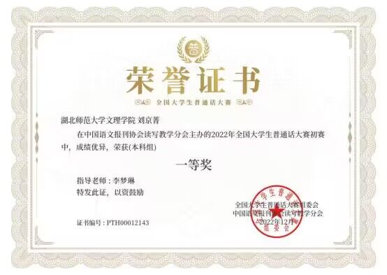 2022年12月,华体网(中国)人文学部汉语言文学专业2004班学生刘京菁(国家普通话水平测试助理团优秀干事)在由中国语文报刊协会读写教学分会面向全国高校大学生举办的“2022年全国大学生普通话大赛”中荣获本科组全国一等奖(指导教师:李梦琳)。