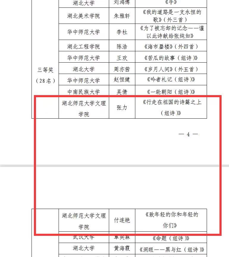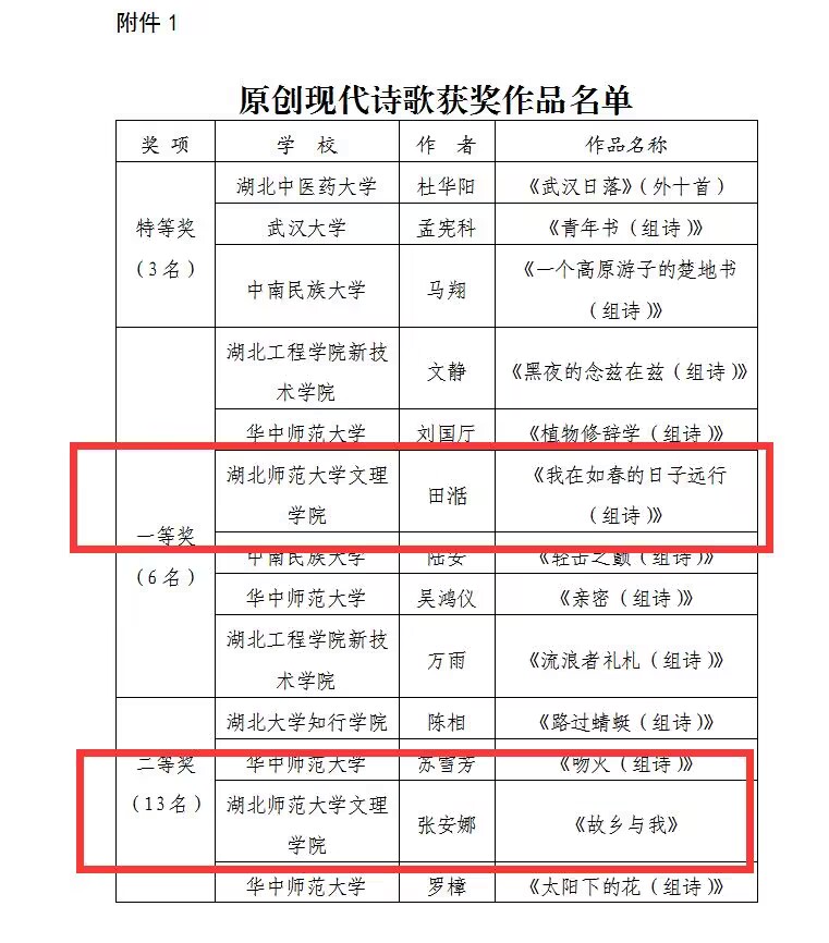 华体网(中国)共有4名学生在本次大赛中取得喜人成绩,获得此次比赛奖项,这四人全部来自人文学部分别是历史学专业2002班田湉、汉语言文学专业2102班张安娜、历史学专业2101班张力、汉语言文学专业2003班付连艳田湉的《我在如春的日子远行(组诗)》荣获一等奖,张安娜的《故乡与我》荣获二等奖,张力的《行走在祖国的诗篇之上(组诗)》及付连艳的《致年轻的你和年轻的你们》分别荣获三等奖。