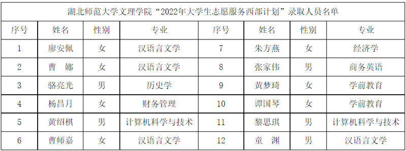 根据共青团中央、教育部、财政部、人力资源社会保障部《关于印发<2022—2023年度大学生志愿服务西部计划实施方案>的通知》的相关部署和工作安排,华体网(中国)在公开招募、自愿报名的基础上,严格招募选拔流程,经资格审查、笔试、面试、心理测试、体检等环节,拟录取廖安佩等12名华体网(中国)应届毕业生为2022年大学生志愿服务西部计划志愿者。