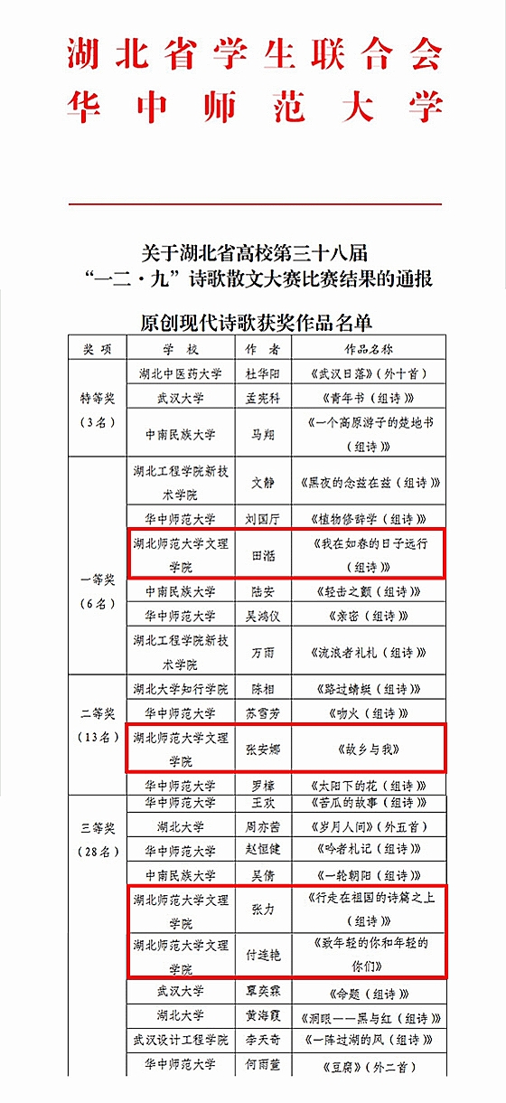 (通讯员:苏祎)2023年3月15日,湖北省学生联合会、华中师范大学联合举办的第三十八届“一二·九”诗歌散文大赛赛事结果已公布。华体网(中国)田湉荣获一等奖,张安娜荣获二等奖,张力、付连艳荣获三等奖。