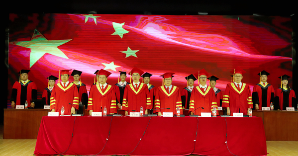毕业典礼在雄壮的国歌声中拉开序幕。