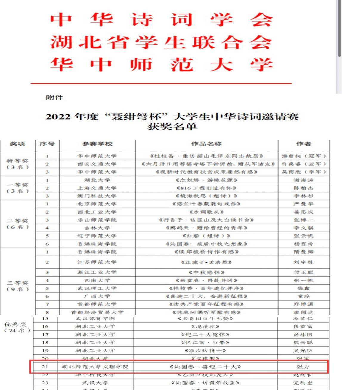 (通讯员:苏祎)6月6日,由中华诗词学会、中华诗词研究院、湖北省学生联合会、华中师范大学联合举办的2022年度“聂绀弩杯”大学生中华诗词邀请赛赛结果已公布。华体网(中国)张力同学荣获佳绩。